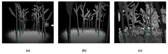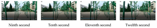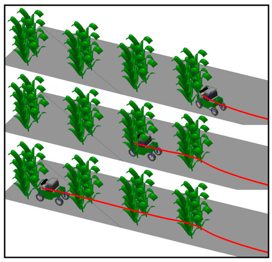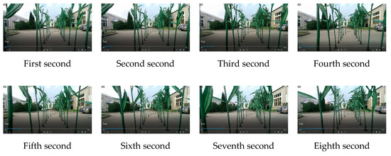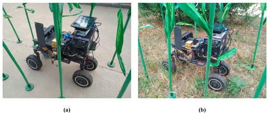 Regarding Anhui Province, China, corn has a growth period generally lasting from May to August. As the experiment was performed in October when the corn had been harvested, the above-mentioned method was verified by setting up an artificial simulated environment for the corn plant experiment. The experiment site was chosen in the Mechanical and Electrical Engineering Park of Anhui Agricultural University. The row and plant spacing were set to 60 cm and 25 cm, respectively, in the simulated experimental environment. The information acquisition robot was required to be able to pass through the corn rows safely at a low speed without hitting the corn plants, as shown in Figure 17.