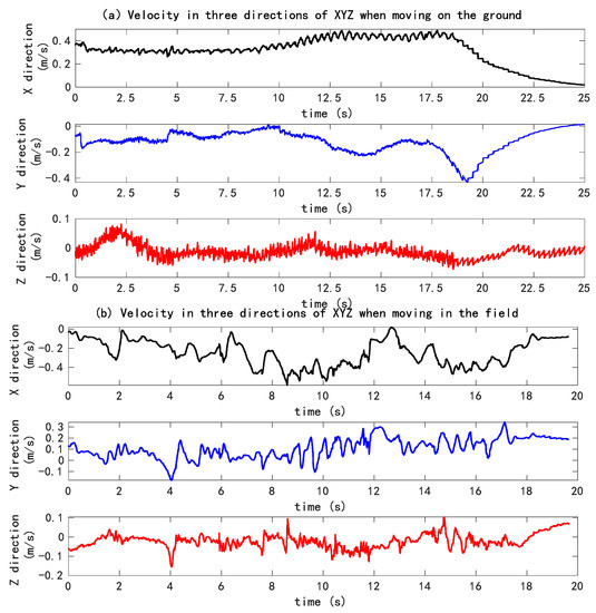 During the process of robot motion, the velocity and acceleration values in three directions of XYZ were collected by the inertial navigation installed on the robot, and the curve was simulated as shown in Figure 19, which shows the speed curve of the machine in three directions of XYZ (X stands for the forward direction of the machine, Y for the lateral direction of the machine, and Z for the vertical direction) under the conditions of the cement road and the grass. According to (a) and (b) in Figure 19, the speed change in Z direction was mainly caused by the machine’s action on the ground during driving. Through the comparative analysis of two kinds of pictures, it can be found that the damping components of the machine need to be further optimized. Compared with the cement ground, the grassland has smaller vibration, which is related to the buffering effect of the grassland itself. Shown in Figure 19a, it can be seen that during the process of moving across the ground, the speed in the Z-axis direction fluctuated around 0 within a small range, which was related to the fact that the experimental conditions mainly involved straight-line driving at the time, and the speed change was mainly caused by the spacing of the simulated plants on both sides and the lateral force of the road on the vehicle; after 18 s, the speed in X direction decreased too quickly, and the machine entered into the turning state; the corresponding speed in Y direction changed as well. Such a state was caused by the control system for the steering motor after the captured images were processed. Shown in Figure 19b, the significant changes of speed in the X and Y directions were related to the greater interference of weeds in image processing, resulting from the frequent regulation and control of the motor by the control system. Concurrently, the experiment was dominated by complex turning conditions (actual field driving, less weeds, and mainly straight-line driving), which led to the great change in the speed curve.