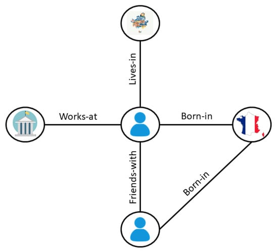 Geo-Social Networks: GSNs consist of entities (such as users, groups, and places) and relationships between them. The relationship between two entities u and v can have several types, such as friends-with, lives-in, born-in and works-at. Consider Bob, a Facebook user born in France, who lives in Seoul, works at Sejong University, and is friends with another French user, Alice. Facebook stores this information by connecting Bob and Sejong University with works-at, Bob and Alice with friends-with and Bob and France with born-in relationships. Figure 2 illustrates the resulting social relationship diagram.