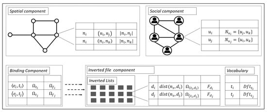 Figure 3 shows the proposed indexing framework structure. The spatial component is used to retrieve adjacent nodes for a given node to allow efficient traversing of the road network. The binding component binds the road network and keywords to the objects using edge id and term id . The social component stores the social relationships of users. Finally, the inverted file component stores data objects along with their descriptions and set of fans.