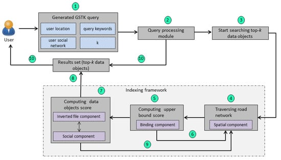 The overview of the proposed query processing methodology is shown in Figure 5. A user initially generates a GSTK query (Step 1 in Figure 5). The query processing module receives a query that has information about user location, query keywords, user social networks, and the number of requested data objects (k) (Step 2 in Figure 5). The query processing module then starts searching the top-k data objects (Step 3 in Figure 5); it utilizes the indexing framework to process the query. First, it accesses the spatial component to start traversing the road network and searches the candidate data objects from the edge where user is located (Step 4 in Figure 5). Next, the binding component is accessed to compute the upper-bound score of edge by using the pre-computed and (Step 5 in Figure 5). If the upper-bound score is less than the current kth data object, then the edge is pruned, and the proposed system continues traversing the adjacent edges (Step 6 in Figure 5). If the upper-bound score is greater than the current kth data object, then the query processing module accesses the inverted file and social components to compute the score of each data object that lies on the edge (Step 7 in Figure 5). Next, the result set is updated by inserting the data objects with a score greater than the current kth data object (Step 8 in Figure 5). The query processing module continues road network expansion to retrieve more candidate data objects that can be in the top-k result set (Step 9 in Figure 5). Finally, the system is terminated when all edges are explored or there is no edge left with an upper-bound score greater than the kth data object, and the result set is returned to the user (Step 10 in Figure 5).