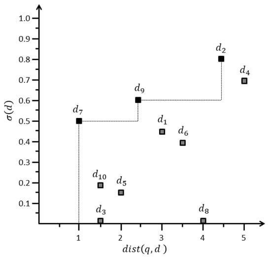To describe the problem definition, consider we have a set of data objects inside range , with and , as presented in Table 3. Figure 6 illustrates the mapping of data objects presented in Table 3 to the distance-score space M. Horizontal and vertical axes represent distance and score , respectively. Lower values are preferred for the distance, whereas higher values are preferred for the score. Figure 6 illustrates that , , and are dominant data objects, and all other data objects are dominated by them. For example, dominates because and . Similarly, dominates because has a superior distance and score. Therefore, , , and are skyline objects , belonging to skyline set SKY i.e., .