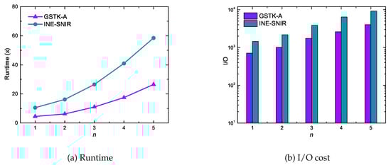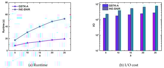 Figure 7 shows the performance of GSTK-A and INE-SNIR with respect to k, the number of requested data objects with the highest scores. Experimental results reveal that the runtime and I/O cost of both the algorithms increased with increasing k, which is unsurprising since more data objects are explored and processed when increasing k. However, GSTK-A significantly outperformed INE-SNIR due to the proposed indexing framework. First, fewer inverted lists were processed due to the upper-bound score and, second, score calculation was highly efficient because the inverted list stores , and .