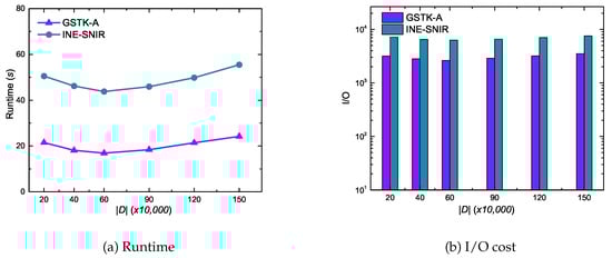 We randomly generated 200 K, 400 K, 600 K, 900 K, 1200 K, and 1500 K data objects on the synthetic dataset to produce various sized datasets to evaluate the scalability of GSTK-A and INE-SNIR algorithms, as depicted in Figure 9. Both algorithms exhibited relatively poor performance when the number of data objects was small or large. Performance degraded for small number of data objects mainly because data object density is low and the algorithms expand more edges to retrieve k data objects. On the other hand, when the number of data objects is large, data objects relevant to query keywords also increase, with consequential increases runtime and I/O cost. The algorithms performed best for 400–600 K data objects.