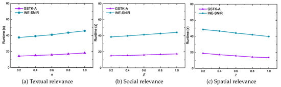 Figure 10 illustrates the impacts from query preference parameters and on GSTK-A and INE- SNIR runtime. For each case, we varied the value of one parameter while maintaining the other two parameters at 0.5. Query preference parameters do not have significant impact on running time, although the performance of both approaches slightly improve when (spatial relevance) has a high preference, because fewer edges are required to be expanded; the performance slightly degrades when increasing and (textual and social relevance, respectively) due to the large number of data objects relevant to the query.