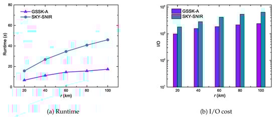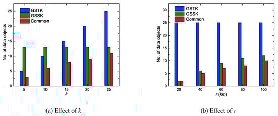 Figure 14a, illustrates the GSTK and GSSK result set outcomes with respect to k for . It is obvious that GSSK returned the same number of skyline data objects within range regardless of k, whereas GSTK returned exactly k data objects. Figure 14b, depicts the GSTK and GSSK result set outcomes with respect to r for . As with fixed r, GSTK always returned the same k number of data objects, whereas the number of data objects in the result set of GSSK increased as r increased. The experimental results demonstrate that the result set of GSTK and GSSK shared many data objects but also included data objects that the other query failed to return. Thus, the proposed GSSK and GSTK queries complemented each other.
