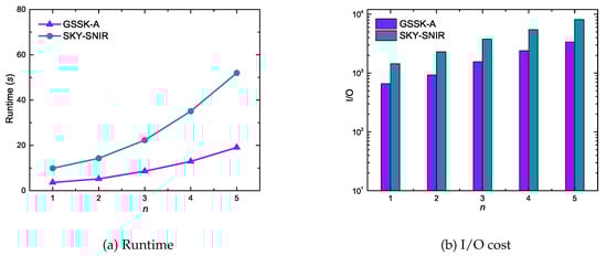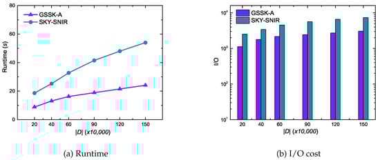 Figure 13 shows data object cardinality effects on GSSK-A and SKY-SNIR performance using the synthetic dataset. In contrast to the experimental results of the GSTK query (Figure 9), the results of the GSSK query reveals that the runtime and I/O cost gradually increased as the cardinality of data objects increased. This is primarily because GSTK queries retrieve the k best data objects, and the algorithms must expand more edges when the search space is less dense, which increases runtime and I/O cost. In contrast, GSSK queries retrieve all data objects in r that are not dominated by any other data object, hence more data objects must be explored and verified as cardinality increases.