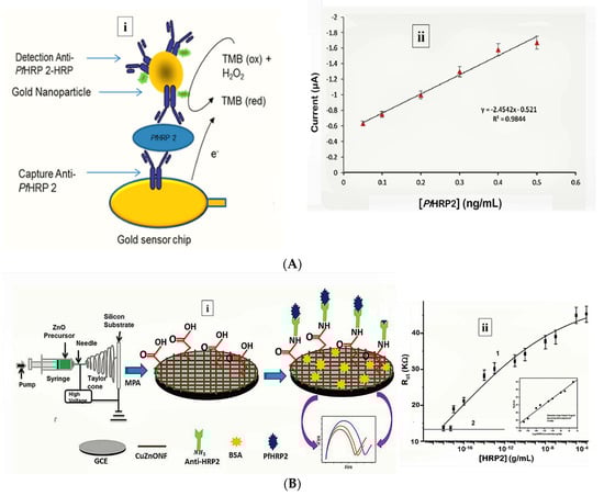 Strategy for (A) labelled amperometric [60] and (B) label free impedimetric [57] electrochemical detection of PfHRP-2. (A) (i) Gold nanoparticle amplified sandwich assay and (ii) plot of chronoamperometric response of PfHRP-2 detection in spiked serum (0.05–0.5 ng/mL PfHRP). Reprinted from Hemben et al. [60] with permission from MDPI. (B) (i) CZnONF dispersions drop-casted onto GCE followed by chemisoption of anti-HRP2 unto MPA treated electrodes and (ii) calibration curve of impedimetric responses obtained after incubating GCE/fCuZnONFs/Anti-HRP2 biosensor with varying concentrations of PfHRP2 (10 ag/mL–10 µg/mL). (Adapted from Paul et al. [57] with permission from Elsevier).