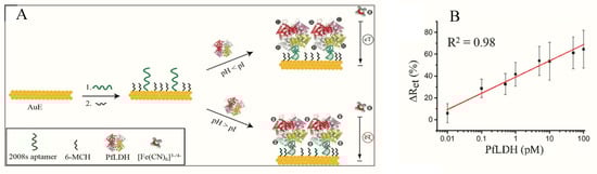 (A) Schematic representation of the PfLDH aptasensor and (B) calibration plot for 0.01 pM–10 nM PfLDH in 5 mM [Fe(CN)6]3−/4− solution at pH 7.5. (Reprinted from Figueroa-Miranda et al. [89] with permission from Elsevier).