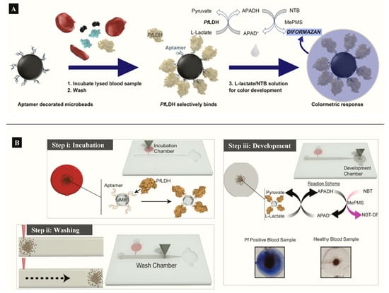 (A) APTEC biosensor based on capturing PfLDH and using its enzymatic activity to produce a colorimetric assay (Reprinted from Dirkzwager et al. [63] with permission from the American Chemical Society). (B) Working principle ((i) incubation, (ii) washing (ii) and (iii) color development) of a simple portable 3D-printed microfluidic device for diagnosis of malaria in clinical samples constructed from the APTEC assay (Reproduced from Fraser et al. [64] with permission from Elsevier).