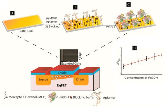 A label-free capacitive aptasensor was constructed by graftting thiolated ssDNA aptamer (NG3) specific to P. falciparum (PfGDH) on a gold electrode [59]. The sensor produced a LoD of 0.77 pM in serum with dynamic range 100 fM−100 nM (Table 1). Subsequently, the authors integrated the process into an extended gate field effect transistor (EgFET).The NG3 aptamers were immobilized on an inter-digitated gold microelectrodes (IDµE) and connected to the FET to construct a sensitive and stable miniaturized aptaFET biosensor (Figure 5) [49]. A benefit of FET-type systems is that, it enables for sensitive and simple electrochemical measurements without requiring a typical redox marker [96]. Following calibration curves in varying concentrations of PfGDH-spiked buffer and serum, a linear detection range of 100 fM–10 nM was obtained with LoDs in buffer and serum being 16.7 pM and 48.6 pM, respectively (Table 1). The FET-based potentiometric sensor was highly selective in the presence of analogous human and plasmodial proteins, making it suitable for analysis of real sample for malaria diagnosis.