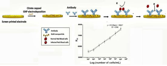 The capture of parasitized RBCs has been proposed as an alternative in overcoming the paucity of known malaria biomarkers. Even at low parasitemia, the populations of parasitized RBCs are elevated, reaching about 10,000 cells/µL in 0.2% parasitemia and 250,000–500,000 infected cell/mL in 5–10% parasitemia [106]. Based on this knowledge, a novel microfluidic SELEX (I-SELEX) was implemented to identify a variant set of aptamers that distinctly bound different epitopes present on parasitized RBC surfaces [107]. In another study, researchers immobilized monoclonal antibodies on a AuNP modified screen-printed electrode as capture elements for malaria-infected cells [47] (Figure 6). Impedimetric changes caused by the interaction of monoclonal antibodies and parasitized RBCs distinguished infected from normal uninfected RBCs, measurable over a linear response concentration range of 102–108 cells/mL of infected RBCs (Table 1).