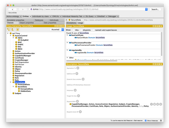From the ORSD, we followed NeOn by carrying out the ontology formalization process, iteratively producing a vocabulary, thesaurus and concept graphs that adequately captured the minimum conceptualization of the data security traits for the IoT scope. After the formalization phase followed the ontology implementation activity in which a computable model in OWL DL language is generated. This development was performed, aided by the Protègè [47] tool, which provides a number of validation and inference helpers and visualization tools, which were very helpful in the development and validation stages. Figure 4 shows the resulting ontology and the different classes captured by it.