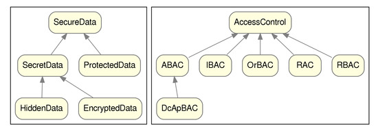Class taxonomy. (a) SecureData class hierarchy. (b) AccessControl class hierarchy.