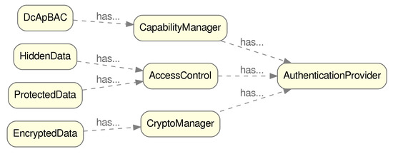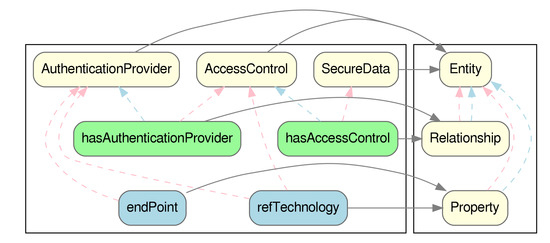 Figure 6 shows the main relations (data properties). Some of those links represent the relations between AccessControl, as well as the CryptoManager and CapabilityManager classes and the AuthenticationProvider class. The information regarding the endpoints related to each one of the entities associated to those classes, is held in a data property of type xsd:anyURI.