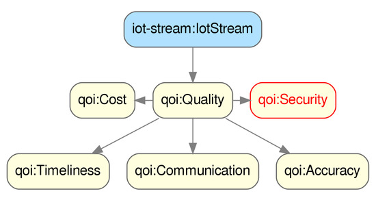 In this project, security was also considered as one of the proposed dimensions of Quality of Information (QoI) as depicted in Figure 8, where we can see that one of the main concepts of IoTCrawler’s ontology is IoTStream, representing an stream of data generated by some sensor. In order to evaluate this dimension of the QoI metric for an IoT data-stream, first a description of the data-security traits associated to that stream is needed.