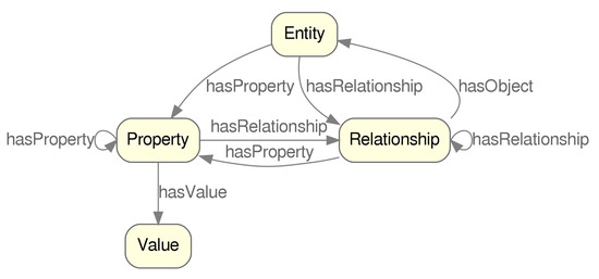 The gist of it is that information in NGSI-LD is contained in Entities which contain Relationships pointing to other entities and Properties, which contain Values. In a sense, they are very similar to objectProperties and dataProperties from OWL. Additionally, both Properties and Relationships can contain further Properties and Relationships, enriching them, adding more information. For example, given an entity which represents a sensor, a property could be the temperature reading, and properties of that reading could be the maximum and minimum values that it could take.