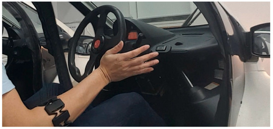 Since the COMS B•COM, a small-scale electric automobile by Toyota Auto Body Co. that is henceforth referred to as the ‘COMS’, has been employed in other studies to develop steering systems, the COMS is a suitable platform for developing an sEMG-controlled interface, as shown in Figure 1 [31,32,33,34]. The measurement of sEMG was realized with the Myo armband, a commercially available sEMG interface device that was introduced in 2013 by Thalmic Labs, Inc., Waterloo, ON, Canada [24]. Although the potential of the Myo armband as method for automotive steering had not been previously investigated, researchers recognized the potential of the armband beyond its original purpose as an entertainment device by successfully controlling devices for daily living such as robotic assistants and prosthetic limbs [35,36,37]. Relative to similar mass-produced sEMG equipment, the Myo armband was chosen as an affordable and accurate device to assess the feasibility of mass-produced sEMG equipment for steering assistance [38].