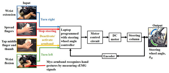 The Myo armband wirelessly transmits detection signals for hand gestures to a PC platform laptop (N17C1, Acer, Inc., Taipei, Taiwan) that implements a steering wheel angle controller through a custom C# program. Based on the type of hand gesture, the steering wheel angle controller sends DC motor commands to a motor control circuit (Controller BLV620K200S-3, Oriental Motor Co., Ltd., Tokyo, Japan). A voltage signal is sent from the motor control circuit to a brushless DC motor (Motor BLV620K200S-3, Oriental Motor Co., Ltd., Tokyo, Japan). The DC motor is connected to the steering column of the COMS automobile by a pair of gears with a ratio of 1:1. These gears allow the steering column to be rotated by the DC motor to adjust the steering wheel angle (SWA), δH. Based on the measured SWA at 100 Hz from an encoder (SKM36S-HVA0-K02, SICK AG, Waldkirch, Germany) that is driven by the steering column, the steering wheel angle controller determines the difference between measured SWA and the target SWA. The steering wheel angle controller alters the command to the motor control circuit according to the difference, thereby achieving closed-loop SWA control.