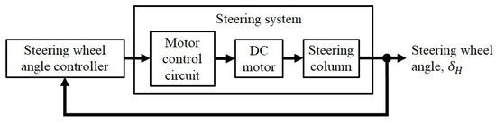 The steering system was defined as an assembly consisting of the motor control circuit, DC motor, and steering column (Figure 3). In accordance with a voltage setting command from the steering wheel angle controller, the motor control circuit provided voltage to the DC motor that rotates the steering column. The output of the steering system was the steering wheel angle.