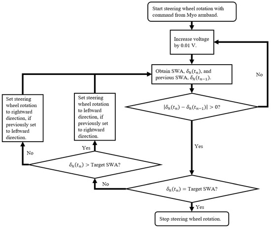 The algorithm was only developed to address steering wheel rotation between 0° and the maximum rightward SWA of 625°, since the COMS only executed right turns in the driving scenarios. When the driver performs wrist extension with the wheel at 0°, the Myo armband recognizes this gesture and sends a command to the steering wheel angle controller to initiate rightward steering wheel rotation. The voltage command sent from the controller to the DC motor control circuit is increased in increments of 0.01 V from an initial value of 0 V (Figure 4). With the exception of the wide U-turn with a radius of curvature equal to twice the minimum turning radius of the COMS, all driving scenarios were designed to be performed with the target SWA being equal to the maximum SWA. In the case of the wide U-turn, trial and error testing determined the target SWA to be equal to 405°.