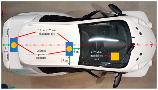 The ground plane antenna closest to the rear of the COMS was the primary antenna through which all vehicle motion parameters were calculated. Since vehicle position, speed, and lateral acceleration were the only parameters examined, it was not necessary to measure pitch and roll by aligning the primary and secondary ground plane antennas along the longitudinal axis of the vehicle, i.e., the dashed red line in Figure 5.