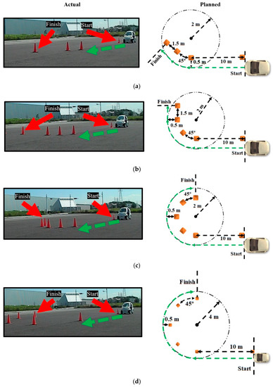 Since the experiment was a means to determine the extent to which the results of previous driving simulator studies conducted by the investigators were applicable to an actual automobile, the driving scenarios were patterned after the driving simulations in [25,26], as illustrated in Figure 6. The test drivers performed several driving scenarios: a 45° turn, 90° turn, narrow U-turn with a radius of curvature equal to the minimum turning radius of 2 m for the COMS, and a wide U-turn with a radius of curvature equal to the twice the minimum turning radius.