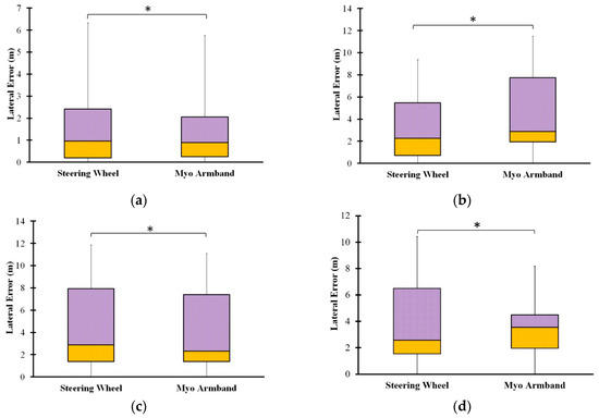 Median lateral errors used to evaluate path-following accuracy of steering wheel and Myo armband in the case of four driving scenarios: (a) 45° turn, (b) 90° turn, (c) narrow U-turn, and (d) wide U-turn. * indicates statistically significant difference between averages of lateral error distributions.