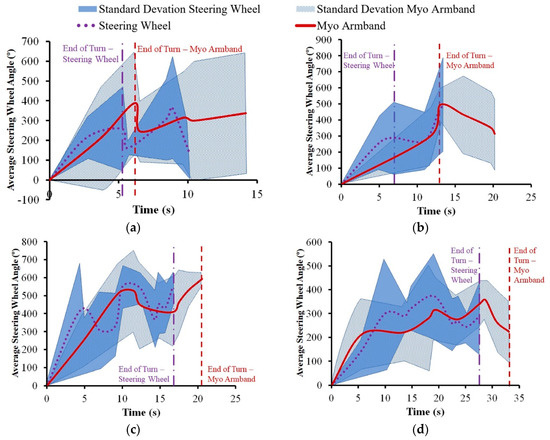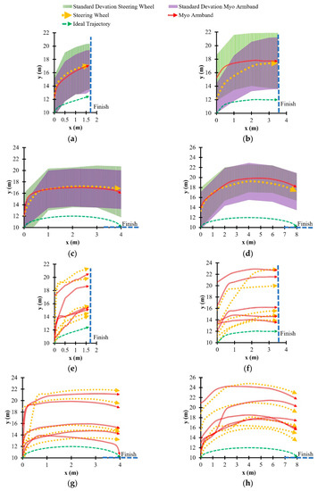 On the other hand, in the cases of the 45° turn and the narrow U-turn, the Myo armband had higher path-following accuracy than the steering wheel. As shown in Figure 8a, the Myo armband was used to initiate turns at a vehicle position along the course that was slightly before the position for the steering wheel. Hence, the drivers did not need to decelerate, as in the case of the 90° turn.