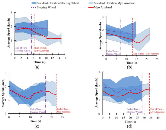Average vehicle speed associated with steering wheel and Myo armband for (a) 45° turn, (b) 90° turn, (c) narrow U-turn, and (d) wide U-turn. Vertical dashed lines indicate average times when drivers exited turns.