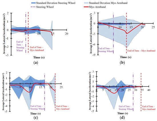 The tendency of the Myo armband to have lower vehicle speed for the wide U-turn and the 90° turn could indicate a tendency of the drivers to avoid understeer by decelerating the vehicle. Another possibility might be a lack of confidence in the Myo armband. Support for these potential explanations, in the case of the 90° turn, is shown by the trajectories in Figure 8b. Relative to the turning trajectory of the steering wheel, drivers used the Myo armband to initiate the turn at a further distance from the beginning of the 90°turn. According to Figure 8f, two out of the five drivers turned at a noticeably further distance than the other three drivers. Since this distinction applies for both the Myo armband and the steering wheel, it is possible that the drivers, rather than the interfaces caused the delayed turning. Although it is possible that the trajectories of these two drivers could have influenced the average trajectory in Figure 8b, the other individual driver trajectories for the Myo armband also tend to be further from the start line than the corresponding trajectories for the steering wheel. Consequently, the drivers may have decelerated the vehicle to reduce understeer or out of a lack of confidence, as suggested by the decreasing speed indicated by Figure 9b. Previous empirical observations indicate that deceleration along a circular path results in lateral acceleration on the vehicle towards the inside of the turn [40]. Therefore, as expected, Figure 10b suggests that centripetal acceleration resulted from vehicle deceleration.