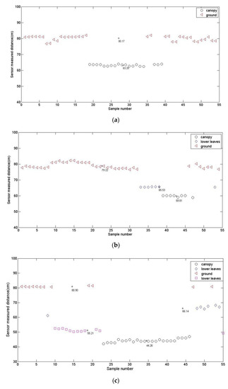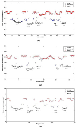 At the beginning, the data measured by an ultrasonic sensor was divided into 3 clusters that represented the crop canopy, the lower leaves, and the ground, respectively. Therefore, the initial number of clusters c is 3. To ensure the reliability of the clustering results, the threshold value ε is generally between 10−4 and 10−6. So, in this paper, it was set to 0.0001 in order to reduce the number of iterations. As for the minimum number of samples θn, the standard deviation θS and the minimum distance between two cluster centers θc, we performed tests by setting different values and verified the accuracy of the clustering results with some known sample data sets. Then, we selected the values that provided the best clustering results as the preset values. Finally, they were set to 20, 5, and 2, separately. The corn plants from the 3-leaf stage to the 6-leaf stage were scanned by an ultrasonic sensor and the data were clustered with the proposed algorithm. The results are shown in Table 1 and in Figure 2.