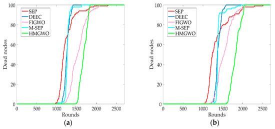 Network lifetime with respect to the number of rounds. (a) The network lifetimes of HMGWO, SEP, DEEC, M-SEP, and FIGWO when is 0.1; (b) The network lifetimes of the HMGWO, SEP, DEEC, M-SEP, and FIGWO when is 0.2.