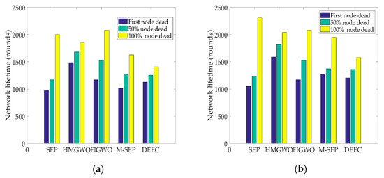 Figure 2 shows that the HMGWO was superior to other protocols in terms of its network lifespan for different proportions of advanced nodes obtained from the simulation. When the ratio of advanced nodes is , it can be seen in Figure 2a that the network lifespan of the HMGWO increased by 55.7%, 31.9%, 46.3%, and 27.0%, respectively, relative to SEP, DEEC, M-SEP, and FIGWO. When the ratio of advanced nodes is , it can be seen in Figure 2b that the network lifespan of the proposed algorithm is increased by 51.2%, 32.0%, 24.6%, and 32.8%, respectively, relative to SEP, DEEC, M-SEP, and FIGWO. The main reason for the above results is that the nodes with low residual energies have a low probability of becoming the CH, which avoids the phenomenon of rapid death of the node with low residual energy, thus extending the life cycle of the network.