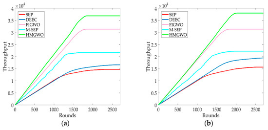 Number of data packets received by the base station. (a) The throughput of HMGWO against SEP, DEEC, M-SEP and FIGWO when is equal to 0.1; (b) The throughput of HMGWO is compared to SEP, DEEC, M-SEP and FIGWO when is equal to 0.2.