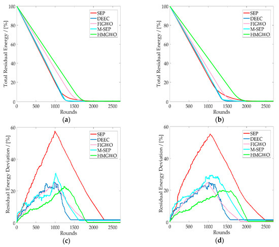 Figure 5a,b show the total residual energy of the network, from which it is obvious that the HMGWO had a higher total residual energy, which means that the network could survive for a longer period of time. As can be seen in Figure 5c,d, the HMGWO effectively reduced the residual energy deviation compared with other algorithms. In HMGWO, the nodes with more remaining energy were selected as the CH more frequently than the nodes with less remaining energy, so the residual energy deviation was more balanced relative to other protocols. The percentage of the total residual energy and the residual energy difference can be calculated by Equations (19) and (20), respectively.