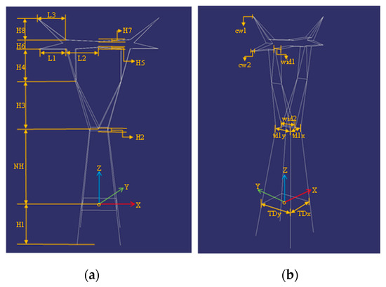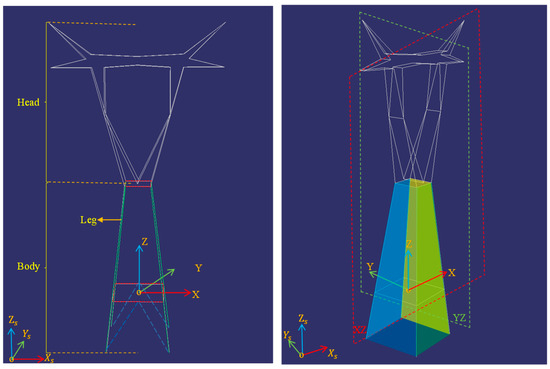 The pylon model is divided into two parts: the pylon body and the pylon head, and the pylon body consists of four principle legs and four side planes, as shown in Figure 2. For the four different types of pylon model, the pylon body has the same parameters and there are two horizontal rectangle structures in the body. The model library is built in full consideration of symmetry and coplanar features. For simplicity, the center of the pylon model is the origin of the right-handed coordinate system. The pylon direction is represented as the angle between the Y axis of the pylon’s local coordinate system and the axis of the object coordinate system. The structures of pylons are mainly symmetric in the XZ plane and YZ plane. The structures on the pylon body are coplanar, with four side planes, as shown in Figure 2b.