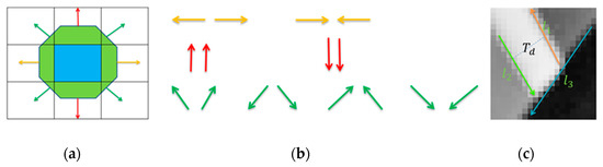 Katahara et al. first proposed the gradient symmetry of a point and applied it in the field of face detection [27]. The eight gradient directions and eight gradient symmetry types are defined as shown in Figure 4a,b. For a point of interest , the gradient symmetry of means that there exists another point in the gradient direction of within a certain distance, and the gradient directions of and are one of the eight gradient symmetry types defined in Figure 4b. This can be extended to the gradient symmetry of a line segment: for a line segment, the gradient symmetry of the line segment means that its gradient direction is parallel to the gradient direction of its neighboring line segment at a certain distance. It can be supposed that the gradient direction of line segment is approximately vertical to the line segment direction. The problem of finding the line segments with gradient symmetry can be simplified to finding the parallel line segments within a certain distance. As shown in Figure 4c, the line segments and are extracted from image, the arrows represent the direction of the line segment, and refers to the distance between and ; if the directions of and are approximate parallel, these two segments can be described as having the feature of gradient symmetry within the distance .