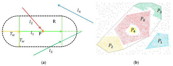 An easy method is employed to merge these initial clusters. Firstly, a convex hull is calculated for each initial cluster. Then, the location correlation is computed between each convex hull and its neighbors. If the convex hull of a cluster is contained by or intersects with another cluster’s convex hull, the two clusters should be merged. Otherwise, the minimum distance between the two convex hulls is calculated. If the distance is smaller than a given threshold, the two clusters should be merged. As shown in Figure 5b, , , , , are the initial clusters. The procedure of merging the clusters is as follows: