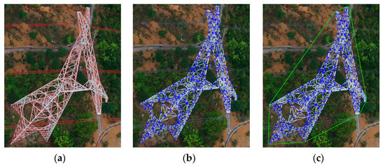 The results of intersection point computation and clustering are shown in Figure 6. The rest of the line segments with red color after filtering with gradient symmetry are shown in Figure 6a. The blue points in Figure 6b are computed with the constraint mentioned above, and these points mainly cover the pylon. These points are clustered, and the final convex hull is shown in Figure 6c in green color. The region of the convex hull can be treated as the proposed region of the pylon.