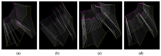 For the identified type of the pylon, the IDSC method matches the sampling points and between the two shape contours by minimizing the matching cost with the inner distance shape context descriptor. Once the minimized matching cost is determined, the matched sampling points’ correlation can be obtained at the same time. The matched sampling points can be used to match the pylon legs. Given the two line segments and of the pylon legs in and , the matching score is defined as