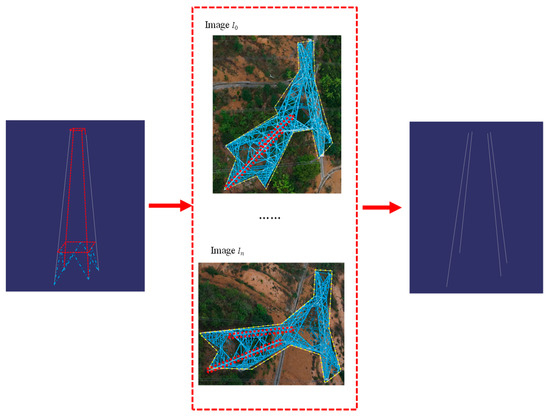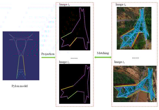 Let be the sequence of visible images of the pylon, each image contains the extracted 2D line segments of the pylon and the shape contours . Let be the identified type of pylon and be the corresponding pylon model. The pylon model consists of connected 3D line segments . The shape contours of the projected pylon model on image are set to be . The sampling points on the pylon shape contours of the image and the projected model are set to be and , respectively.