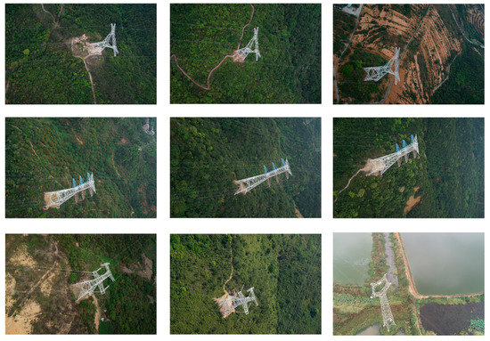 Five flight datasets which contain 15 pylons are applied in the experiments. There are nine images from the 15 pylons that are presented in Figure 10. The first four flight datasets are in mountain areas and the last one is near waters. The camera calibration and image orientation were performed using the free software MicMac [32]. The experiments were all conducted on Intel Core i7 CPU machine with NVidia GTX960 graphic card, 16GB RAM and 64-bit Windows 7 OS and implemented by C++.