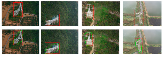 The results of pylon detection. The first row is the result of pylon detection by the DPM method and the second is the proposed method. The red rectangle is the detected bounding box location of the pylon. In the second row, the green polygon is the proposed region.