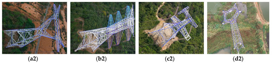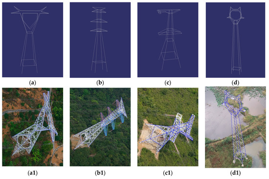 Samples of four type pylon reconstruction results. (a–d) are the reconstructed pylon models of Type 1, Type 2, Type 3 and Type 4, respectively. The second and third rows are the projected model from different image perspectives.