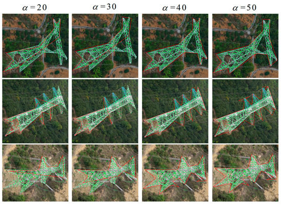 The shape contours of pylon extraction is a key step for pylon reconstruction. It is closely related to pylon type identification, and the pylon reconstruction process. If there is great deformation between the extracted shape contours and the real contours of pylon, the pylon type identification and reconstruction process may fail. The parameter in alpha shape controls the desired level of detail. For each real number , when , it is a closed disk of radius . To determine the impact of the parameter in alpha shape method on the shape contour extraction results, four values are applied in images with different pylon types, and the results are shown in Figure 11.