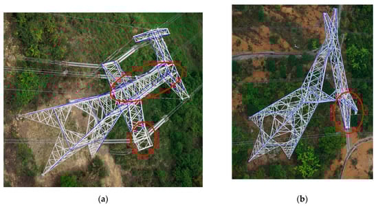 - The pylon is usually vertical. However, due to some complicated reasons, the pylon may be inclined. The model-driven method cannot adapt this situation. In addition, if there are some small irregular parts that are not defined in the pylon library, the proposed method cannot reconstruct the irregular parts. As shown in Figure 14a, the pylon head is inclined, which causes the related cross arms in the pylon head to deviate from the projected line segments of the reconstructed pylon model. In addition, the right bottom cross arm is unsymmetrical with the left one, there is an affiliated structure connected with the cross arm. The affiliated structure in different pylons with the same type always changes, which is improper for defining such structures in the model. One solution to this problem is to introduce a primitive-based model library to enhance the adaptability of the pylon model.