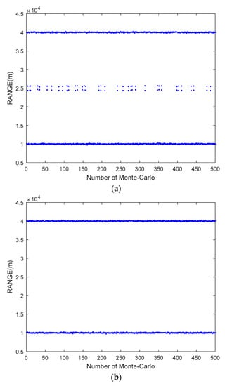 In this section, the SNR is set to 10 dB, and the number of snapshots is 50, and the number of transmitting array elements M and receiving array elements N are both set to eight. Figure 3a,b shows the unpaired and paired estimation of range, respectively, obtained by the proposed algorithm, where the two-dimensional parameters of the target are set to (45°, 40 km) and (30°, 10 km). It is noted that an incorrect range estimation is shown in Figure 3a, which is caused by the mismatch between the eigenvalues of and . It is seen in Figure 3b that the pairing method can obtain the correct range estimation. Figure 4a,b shows the estimation results of angle and range acquired by the proposed algorithm and the ESPRIT algorithm, where the targets in Figure 4a are the same as those of Figure 3, and the targets in Figure 4b are assumed to be (45°, 40 km) and (−30°, 70 km). As there is no period ambiguity for (45°, 40 km) and (30°, 10 km), the proposed algorithm and the ESPRIT algorithm can both obtain accurate estimation, as shown in Figure 4a. It is shown in Figure 4b that the proposed algorithm can effectively solve the period ambiguity, because (−30°, 70 km) satisfies sinθk − 4Δfrk/c ∈ (−3, −1).