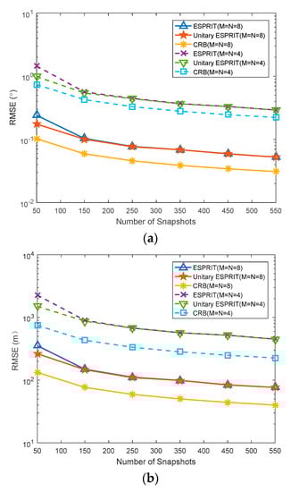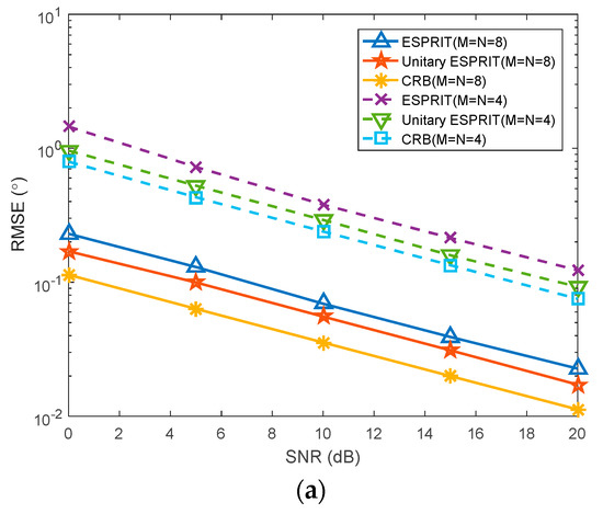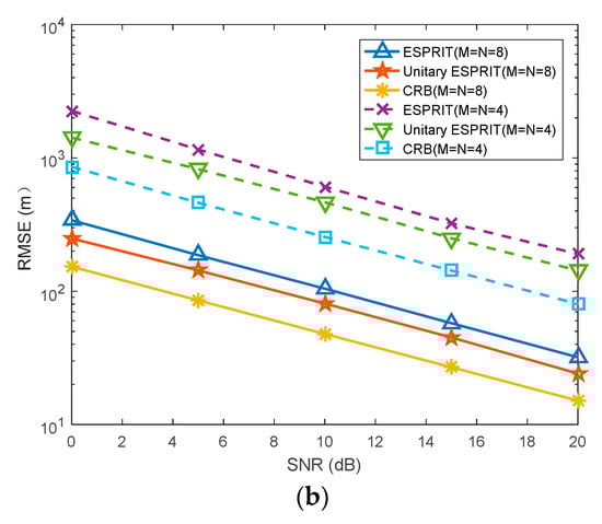 In this section, the target is set to (45°, 40 km) and (30°, 10 km), and the number of snapshots is 50. The number of transmitting array elements M and receiving array elements N are set to M = N = 4 and M = N = 8, respectively. The SNR increases from 0 dB to 20 dB, with each step being 2 dB. Figure 5a,b shows the root mean square errors (RMSEs) of the proposed algorithm and the ESPRIT algorithm with the different SNR. Meanwhile, the CRBs of angle and range in the monostatic FDA-MIMO radar are chosen for the assessment of the performance of the proposed algorithm. The RMSEs of angle and range are respectively defined as