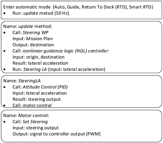 This algorithm requires a frequency of 50 Hz (method name: update), meaning that the update method is used 50 times per second. The method is activated only in automatic mode, meaning that only the automatic modes Auto, Guided, Return to Dock (RTD), and Smart RTD use this method. The automatic modes make use of all navigation sensors, and valid sensors readings are compulsory for automatic mode activation. Any missing sensors’ data are unable to activate this function. Moreover, the Auto mode requires a programmed route (route plan), the RTD mode requires a dock (home) position and a saved travelled route to perform smart RTD, and the Guided mode requires a desired point location. All data are provided in the form of geographical waypoints (WPs).